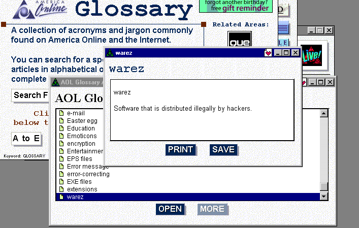 Mixed in with explanations of the terms "e-mail" and "emoticon" was a definition for "software that is distributed illegally by hackers." AOL's Terms of Service prohibit the trading of this software--so it seems they wouldn't want to advise users of the practice.